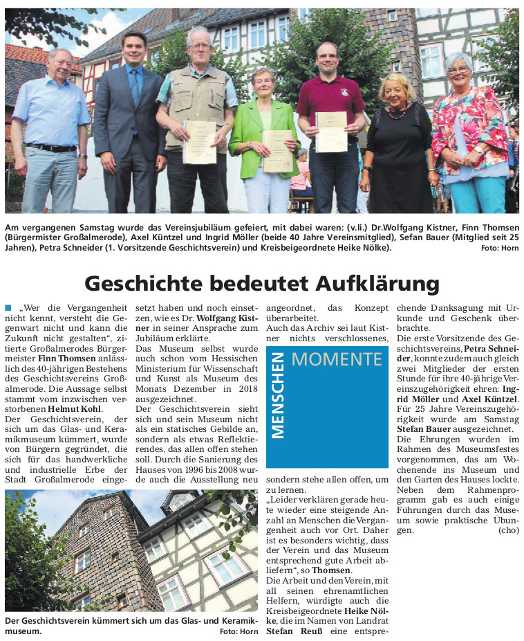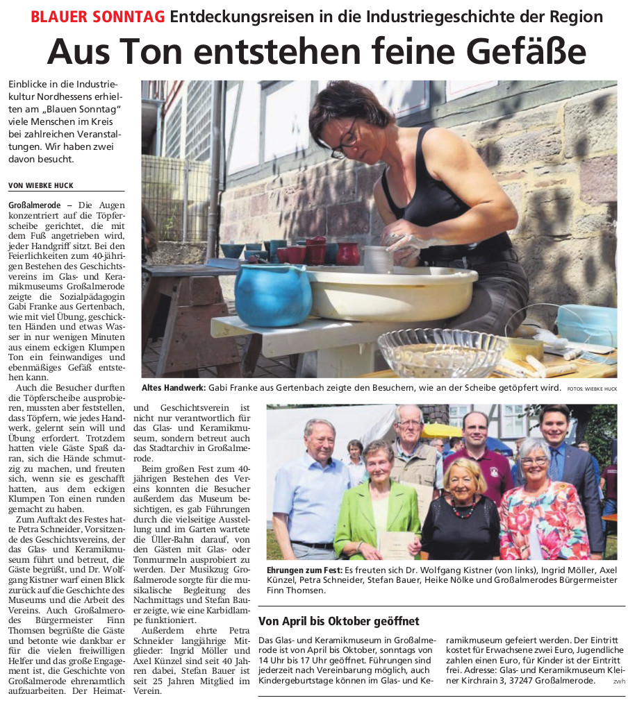 Der Geschichtsverein Großalmerode als Träger des Glas- und Keramikmuseums hat am Sonntag, den 11. August 2019, sein 40jähriges Bestehen mit einem Museumsfest gefeiert.