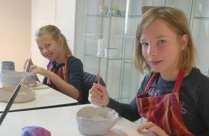 Sarah töpfert wegen ihres Bruders. Elias hatte schon einen Töpferkurs in der Schule. „Ich habe gesehen, was er aus dem Kurs mit nach Hause gebracht hat, und wollte das auch probieren“, sagt sie. „Es macht Spaß, weil wir schöne Dinge bauen und viel Quatsch machen.“ Der andere Junge im Kurs hatte für diesen Termin abgesagt, daher malt ihr Bruder an diesem Tag nur mit Mädchen. „Das ist er gewohnt“, sagt Sarah. „Zu Hause sind oft Mama, Oma und ich da.“